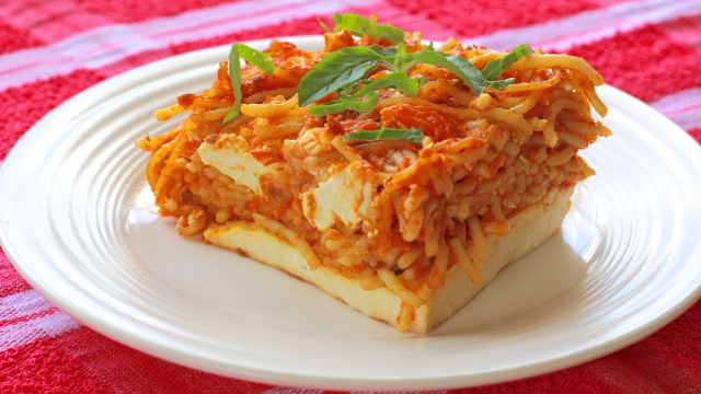 This Spaghetti Pie is loaded with cow products! Paneer, yogurt cheese, cream and ghee! Yum-alicious!!